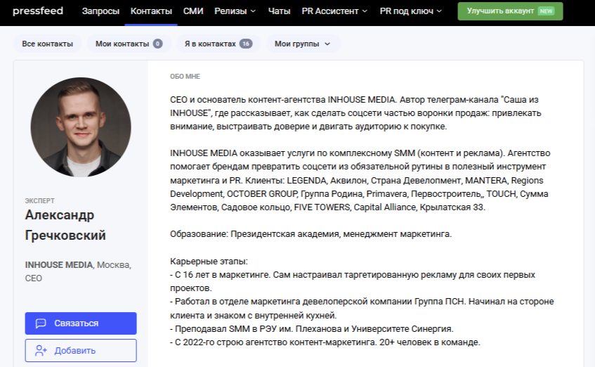 Расскажу о персональном продвижении моего клиента — CEO и основателя контент-агентства INHOUSE MEDIA Александра Гречковского.