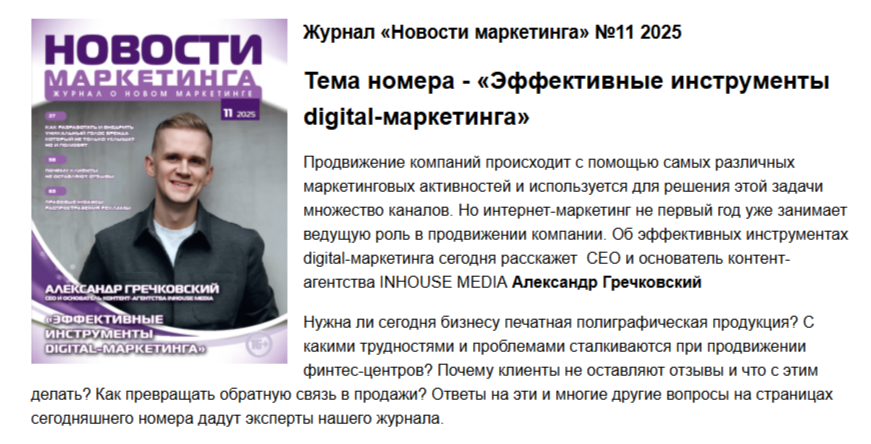 Два шага до обложки журнала. Всего двух принятых статей хватило, чтобы попасть на обложку журнала «Новости маркетинга» в ноябре. Это был приятный бонус и мощный импульс для продвижения заказчика.