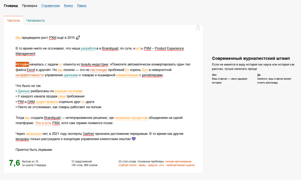 Разработка Максима Ильяхова, одного из самых известных редакторов Рунета. «Главред» помогает убрать из текста все лишнее: воду, канцелярит, штампы из серии «динамично развивающаяся компания».