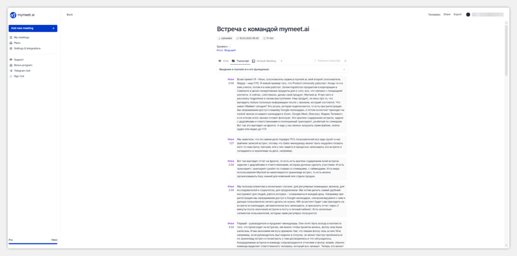 mymeet.ai записывает встречи, расшифровывает разговор и сразу формирует структурированный протокол. Получаете не просто текст, а документ с задачами, ответственными и дедлайнами или сразу черновик статьи.